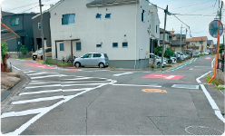 【交差点のコンパクト化+歩行者待避場所の確保】、【グリーンベルトによる児童の歩行空間の確保】、【通過車両への減速喚起】を行えるよう提案し、施工をしてまいりました。