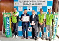 今回のボランティア活動に対して、8月29日に知多市の市長応接室において贈呈式を執り行うことができました。知多市からは宮島壽男市長様(当時)始め、担当部署の皆様にご出席をいただき活動の報告をしてまいりました。